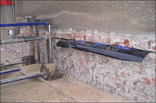 Nejdříve se otluče v místě podřezání vlhkého zdiva omítka, zarovná se podklad v šíři 1,5 m pro umístění stroje a poté se provede do zdiva řez, který se očistí od nečistot. Do vytvořené drážky vloží 2 mm silná hydroizolační PE fólie, zdivo se zajistí statickými plastovými klíny v rozteči 20 cm – 30 cm a následně se provede zainjektování (vyplnění) proříznuté spáry cementovou maltou s plastifikátorem.